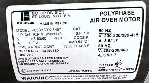 Emerson P63SYDYK-3497 Polyphase Air Over Motor 3/4 HP 1140 RPM 50/60 Hz 3 Ph