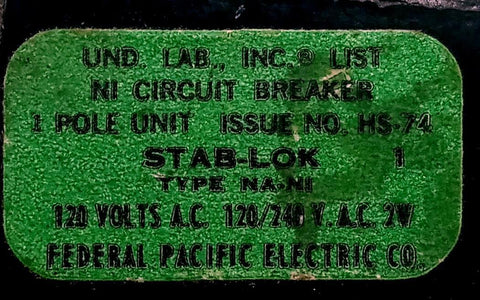 This is a fixed listing for a Federal Pacific Electric NA20 Stab-Lok 1 Pole Circuit Breaker 20A 120V Plug-In