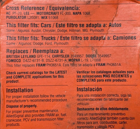 Fram PH43 Oil Filter AlliedSignal Extra Guard Full Flow Lube Threaded