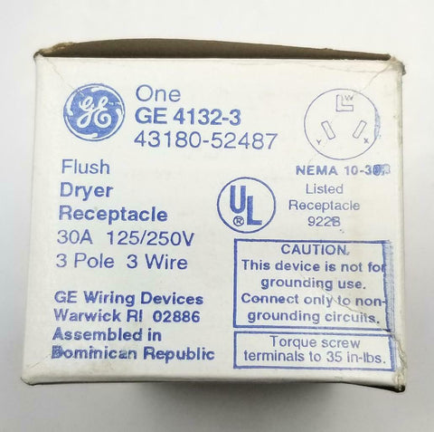 General Electric GE4132-3 Flush Dryer Receptacle 30 A 3 Pole (9 Available)