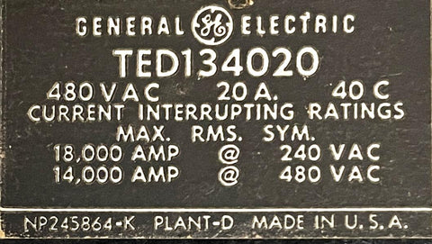 General Electric TED134020 3-Pole Circuit Breaker 20A 480V 3 Phase