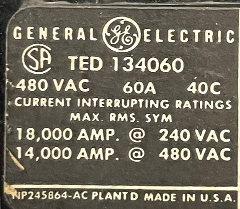 General Electric TED134060 3-Pole Circuit Breaker 60A 480V 3 Phase Bolt-On