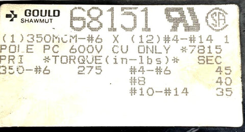 GOULD SHAWMUT 68151 Power Distribution Terminal Block 600VAC 1 Pole