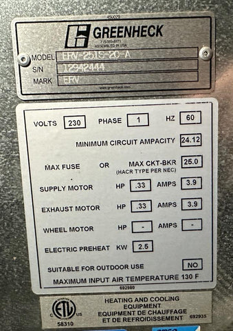 Greenheck ERV-251S-20-A Energy Recovery Ventilator 1/3 HP 2.5 kW 230V 1 Phase
