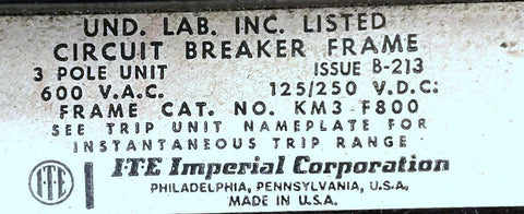 ITE KM3-F800 800A 3-Pole Circuit Breaker 600VAC 125/250VDC 3 Phase Bolt-On