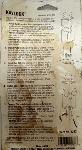 This Listing is for a KeyLock Newel Post Fastener Model: 6283 SPECIFICATIONS: Brand: KeyLock Type: Newel Post Fastener Condition: New Weight: 10.4 oz This unit is exactly as pictured and fully guaranteed.