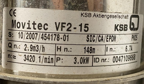 KSB Movitec VF2-15 High Pressure Pump 3 kW 3420 RPM