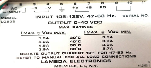 Lambda LQ532 Regulated Power Supply Input 105-132V 47-63Hz Output 0-40VDC 5A Max