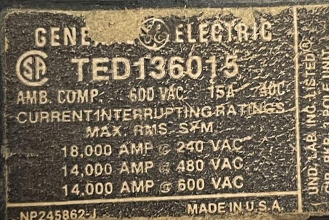 Lot of (2) General Electric TED136015 3-Pole Circuit Breaker 15A 600V 3 Phase