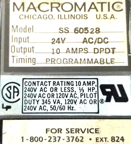 Macromatic SS 60528 Programmable Interval Time Relay 24VAC-DC 10A DPDT W/ Base