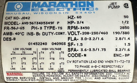 Marathon Electric AVD 56T34D5349F P Jet Pump Motor 3/4 HP 3450 RPM 230/460V