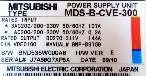 Mitsubishi Electric MDS-B-CVE-300 Servo Power Supply 30kW 144A 200-230VAC 3Phase