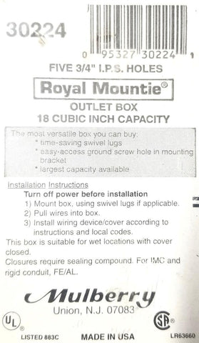 Mulberry Royal Mountie 30224 Outlet Box 3/4" Holes 18"³ Capacity