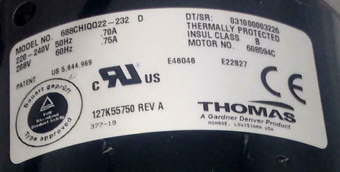 New Thomas 688CHIQQ22-232 AC Pump Motor Assembly 208-220-240 VAC 50/60 Hz USA