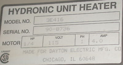 You are bidding on a VERY NICE DAYTON VERTICAL HYDRONIC UNIT HEATER MODEL 3E416.