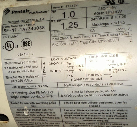 Pentair SF-N1-1A Pool Pump 1 HP 115/230V Single Phase 340038