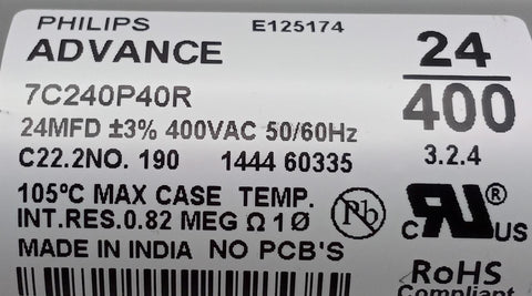 Philips Advance 7C240P40R Dry Film HID Capacitor 400VAC 50/60HZ 105°C Max +/-3%