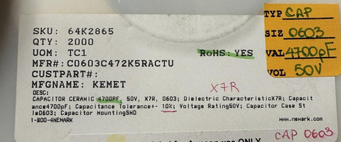 Reel of 1684 Kemet C0603C472K5RACTU Multilayer Ceramic Capacitor 4700pF 50V 0603