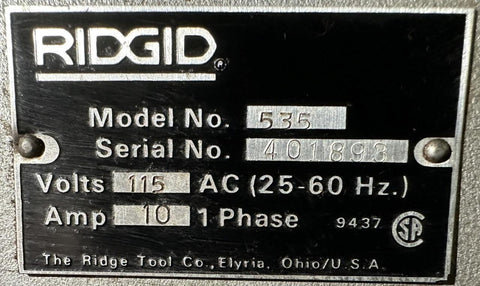 Ridgid 535 Pipe Threader w/ Cart 10A 115V Single Phase 1/8" to 2" 1/4" to 2"