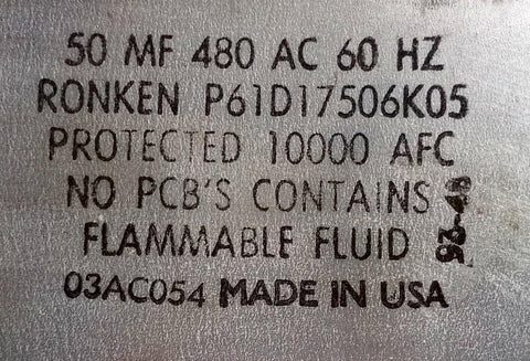 Ronken P61D17506K05 Capacitor 50MF 480VAC 60HZ Protected 10,000 AFC 03AC054