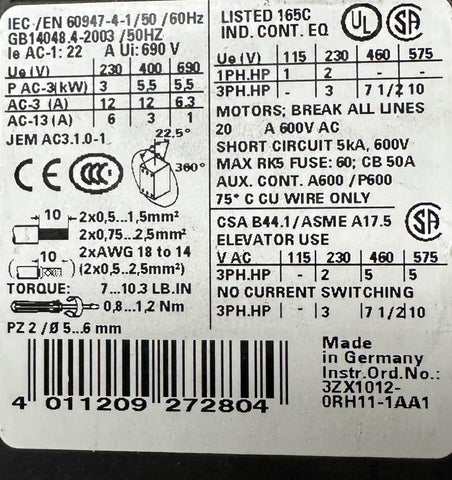 Siemens 3RT1017-1AB01 Power Contactor 3-Pole 5.5 kW 24 V AC Coil 50/60 Hz