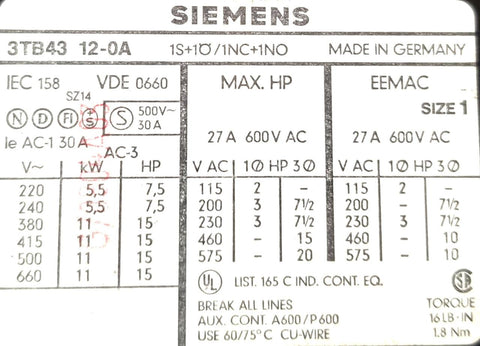 Siemens 3TB43 12-0A Contactor IEC 158 VDE 0660 500V 30A AC-1 600VAC