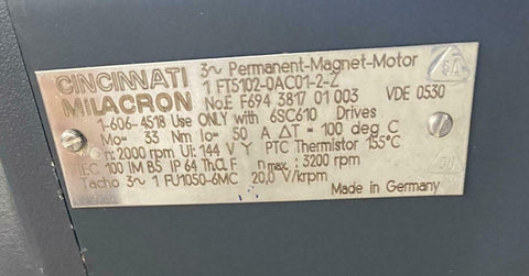 You are Purchasing a Siemens Cincinnati Milacron 3-Phase Permanent Magnet Motor. Model: 1FT5102-0AC01-2-Z This Motor is in Great Condition and Fully Guaranteed. 144 V 60 Hz Amp Rating 50 33 Nm RPM 2000/3200 ~ International bidders are always welcome ~