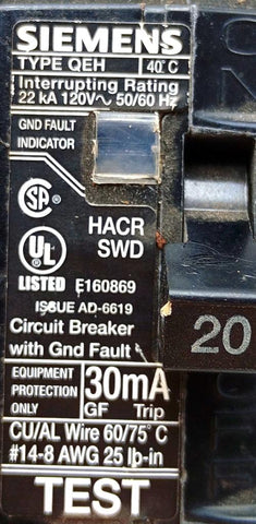 Siemens QE120H 1-Pole Ground Fault Circuit Breaker 20A 120V 30mA Trip