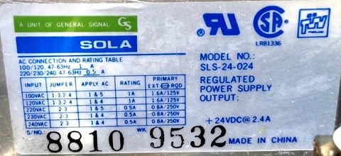 Sola SLS-24-024 General Signal Regulated Power Supply 47-63HZ 24VDC 120/240VAC