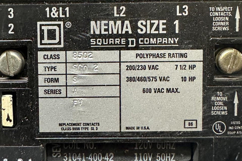 Square D 8502SC02 Contactor Series A 110/120 V 50/60Hz Coil NEMA Size 1