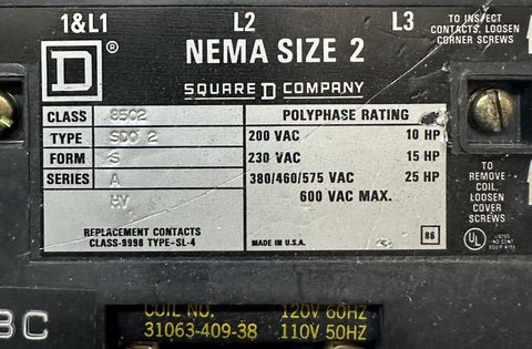 Square D 8502SD02 Contactor Series A 110/120V 50/60 Hz Coil NEMA Size 2