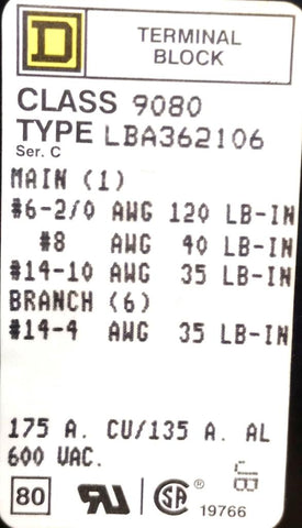 Square D 9080LBA362106 3-Pole Power Distribution Block 175A CU / 135A AL 600VAC