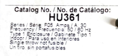 Square D HU361 Heavy Duty Safety Switch 30A 600V Ser F05 General Purpose Type 1