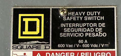 Square D HU362 Heavy Duty Safety Switch 60A 600V