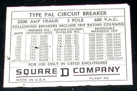 Square D PAF361800 Circuit Breaker 3-Pole 1800 Amp 600 VAC AS-IS
