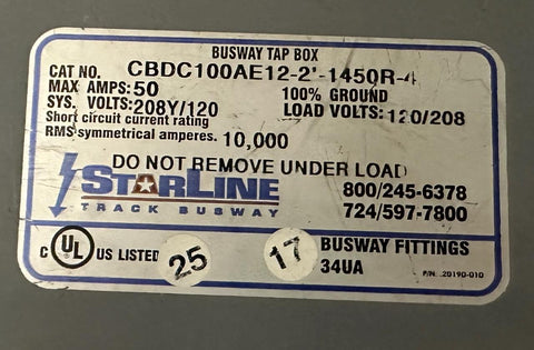 Starline CBDC100AE12-2'-1450R-4 Busway Tap Box 50A 208Y/120 VAC 100% Ground