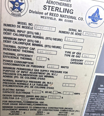 Sterling QVEF-150 Natural Gas Unit Heater 150K BTU 115V