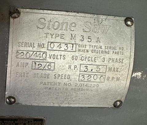 Stone M35A Abrasive Steel Cut Off Chop Saw 3.5 HP 3200 RPM 220/440V 3 Phase