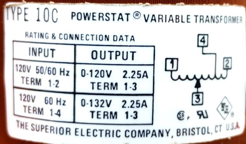 Superior Electric Type 10C Powerstat Variable Transformer 120V 50/60HZ 2.25A