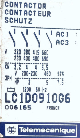Telemecanique LC1D0910G6 3-Pole Contactor 9A 600V 3-Phase 120V 60HZ Coil