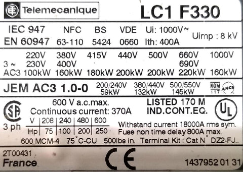 Telemecanique Square D LC1F330 Contactor 600VAC Max 370A Cont. Current 3PH