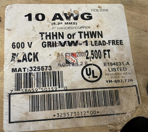 THHN THWN-2 Stranded Copper Wire 10 AWG Black 600V VW-1 2500 FT