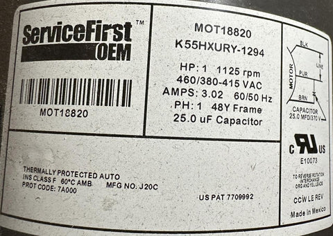 Trane ServiceFirst OEM MOT18820 Condenser Fan Motor 1 HP 1125 RPM 460V 1 Phase