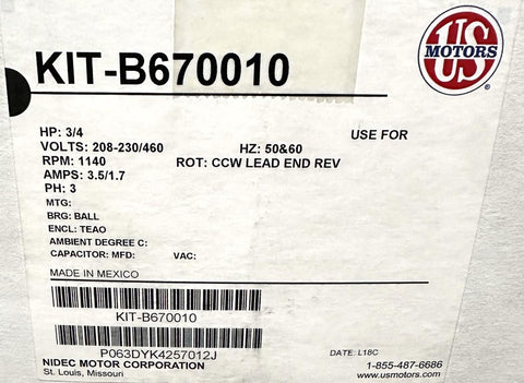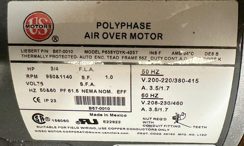 US Motors P63SYDYK-4257 Polyphase Air Over Motor B67-0010 3/4 HP 1140 RPM 3 PH