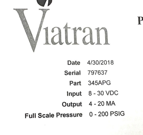 Viatran 345APG Pressure Transmitter 8-30 VDC 4-20 MA 0-200 PSI Model 345