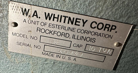 WA Whitney Esterline Model 92 Punch Press 10 Ton