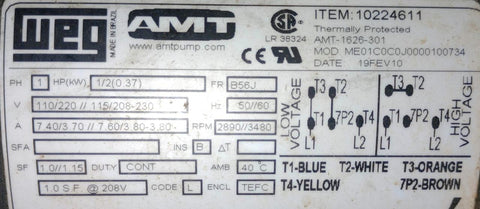 WEG AMT 1626-301-00 Pump Motor 1/2HP 50/60HZ 2890/3480RPM 1PH 110/220V